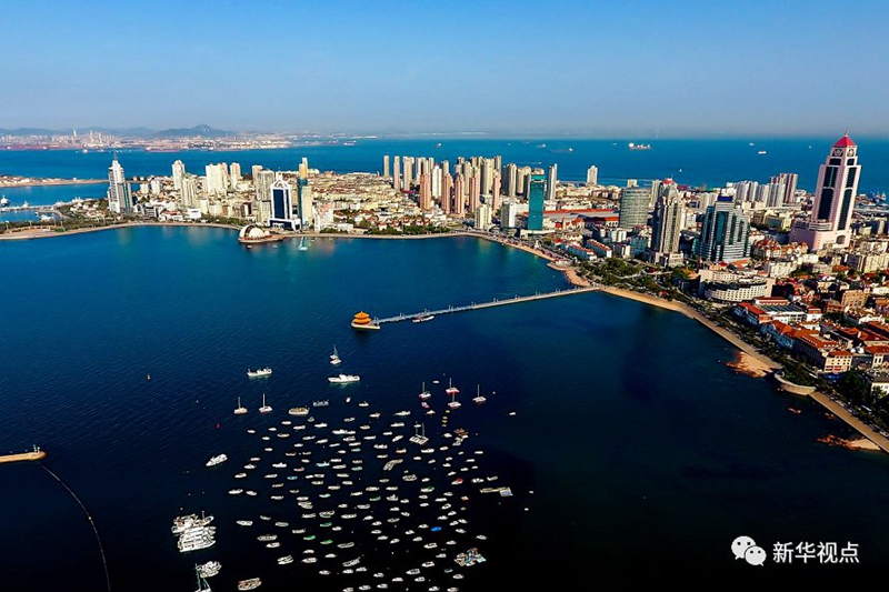 这是2018年5月4日无人机拍摄的栈桥和青岛湾。新华社记者郭绪雷摄