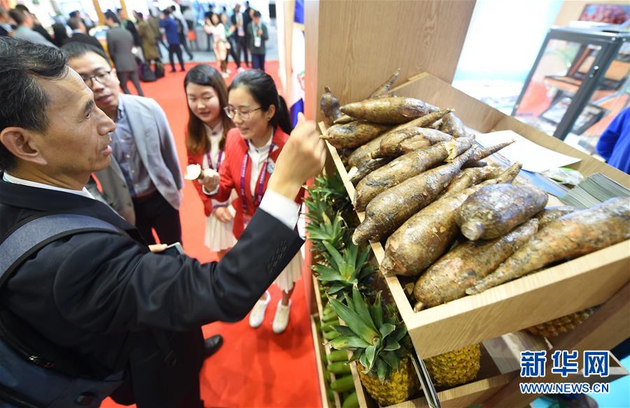 11月6日,参会者在首届中国国际进口博览会多米尼加展区观看展出的农产品。新华社记者韩瑜庆摄