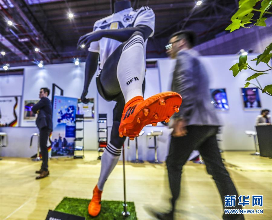 11月6日,参观者从首届中国国际进口博览会德国展区的德国足球国家队2018年球衣展品旁走过。新华社记者殷刚摄
