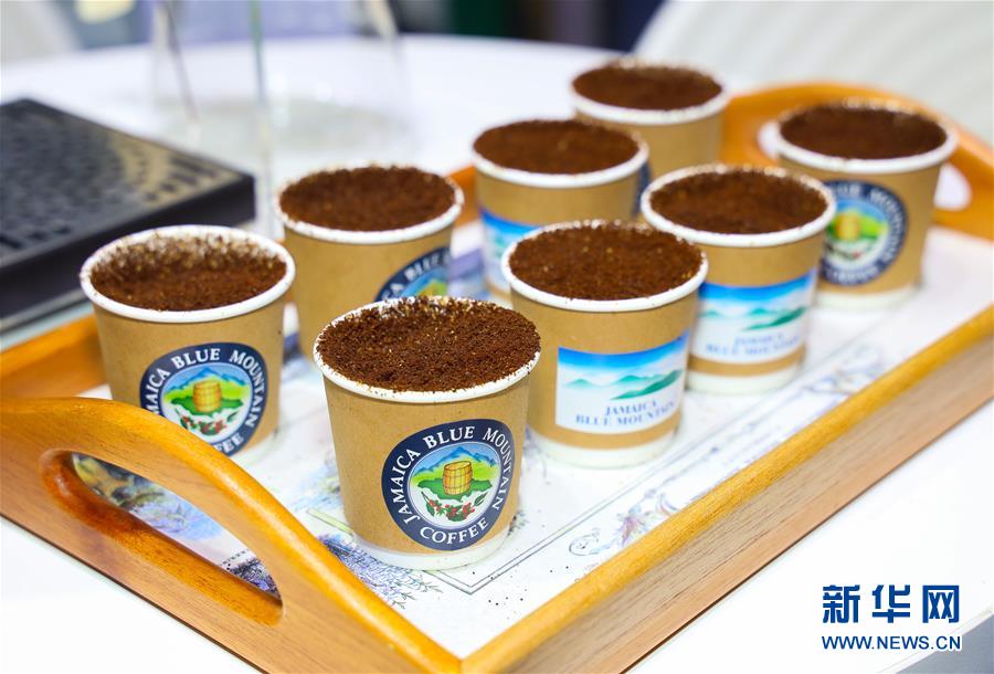 这是首届中国国际进口博览会加勒比地区国家展区牙买加展台展出的蓝山咖啡(11月6日摄)。新华社记者刘大伟摄