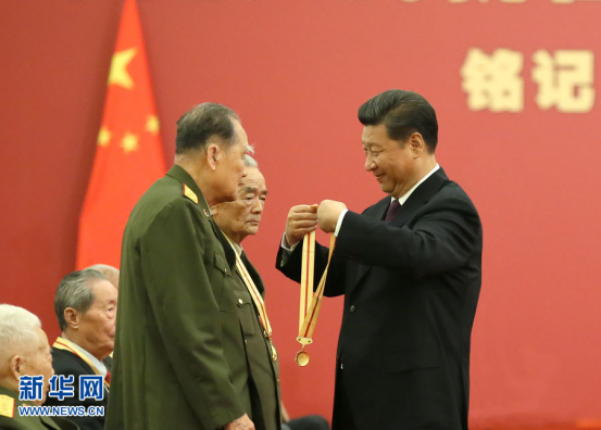 2015年9月2日,中国人民抗日战争胜利70周年纪念章颁发仪式在人民大会堂隆重举行。习近平为30名抗战老战士老同志、抗战将领、帮助和支持中国抗战的国际友人或其遗属代表,一一佩挂纪念章。