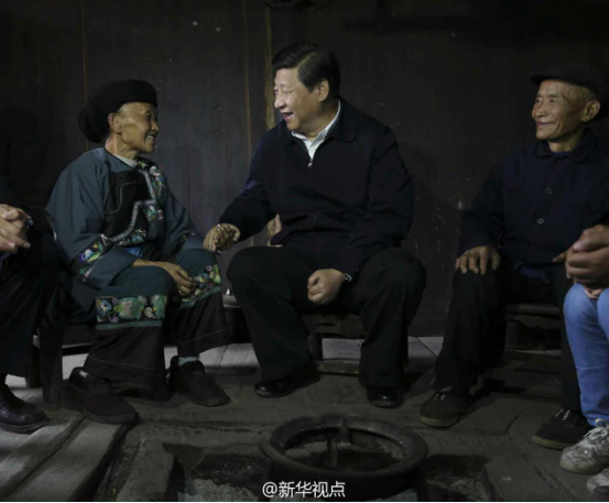 2013年11月3日,习近平沿着狭窄山路辗转来到十八洞村特困户施齐文家。木屋四壁黝黑,一盏节能灯是唯一“电器”。老人老伴石爬专问:“怎么称呼您?”村主任说:“这是总书记。”习近平握住老人的手询问年纪,听说老人64岁了,他说:“你是大姐。”