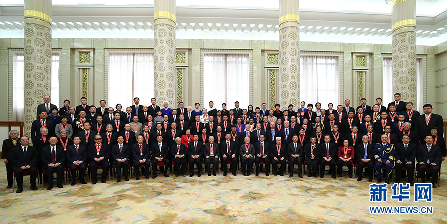 12月18日,庆祝改革开放40周年大会在北京人民大会堂隆重举行。中共中央总书记、国家主席、中央军委主席习近平在大会上发表重要讲话。这是习近平等为获得中国改革友谊奖章人员代表颁奖。 新华社记者 鞠鹏 摄