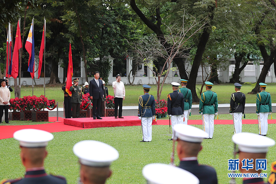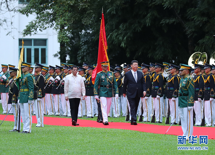 菲律宾总统府充满庄严、隆重、热烈的气氛。当地时间下午4时40分许,习近平乘车抵达总统府,受到杜特尔特热情迎接。两国元首登上检阅台。仪仗队行持枪礼。鼓手敲起激昂的鼓点,号手吹响迎宾的号声。军乐队奏中菲两国国歌。现场鸣放21响礼炮。习近平在杜特尔特陪同下沿红地毯检阅仪仗队。检阅毕,习近平同菲方主要官员握手,杜特尔特同中方陪同人员握手。两国元首共同前往总统府主楼。沿途,当地艺术家伴着菲律宾传统竹管弦乐翩翩起舞,悠扬的乐声、曼妙的舞姿吸引两国元首不时驻足欣赏。