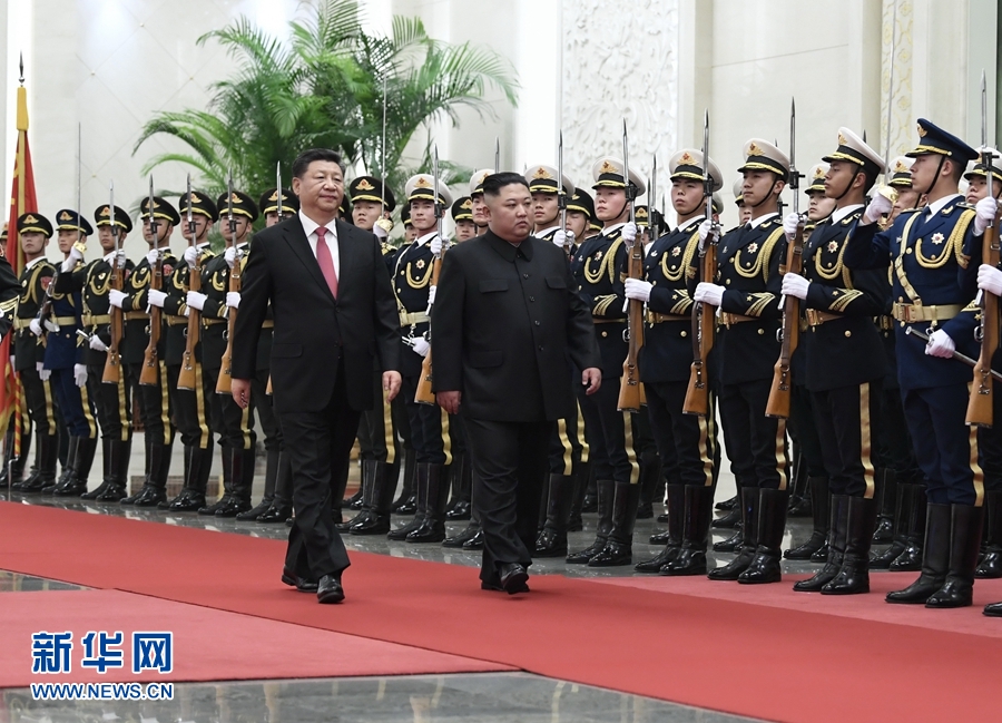 1月8日,中共中央总书记、国家主席习近平同当日抵京的朝鲜劳动党委员长、国务委员会委员长金正恩举行会谈。会谈前,习近平在人民大会堂北大厅为金正恩举行欢迎仪式。 新华社记者 黄敬文 摄