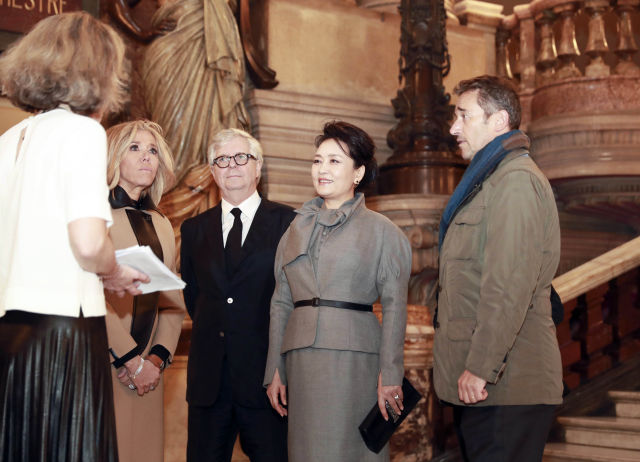 当地时间3月25日,国家主席习近平夫人彭丽媛在法国总统夫人布丽吉特陪同下参观位于巴黎市第九区的法国巴黎歌剧院。新华社记者 丁林 摄