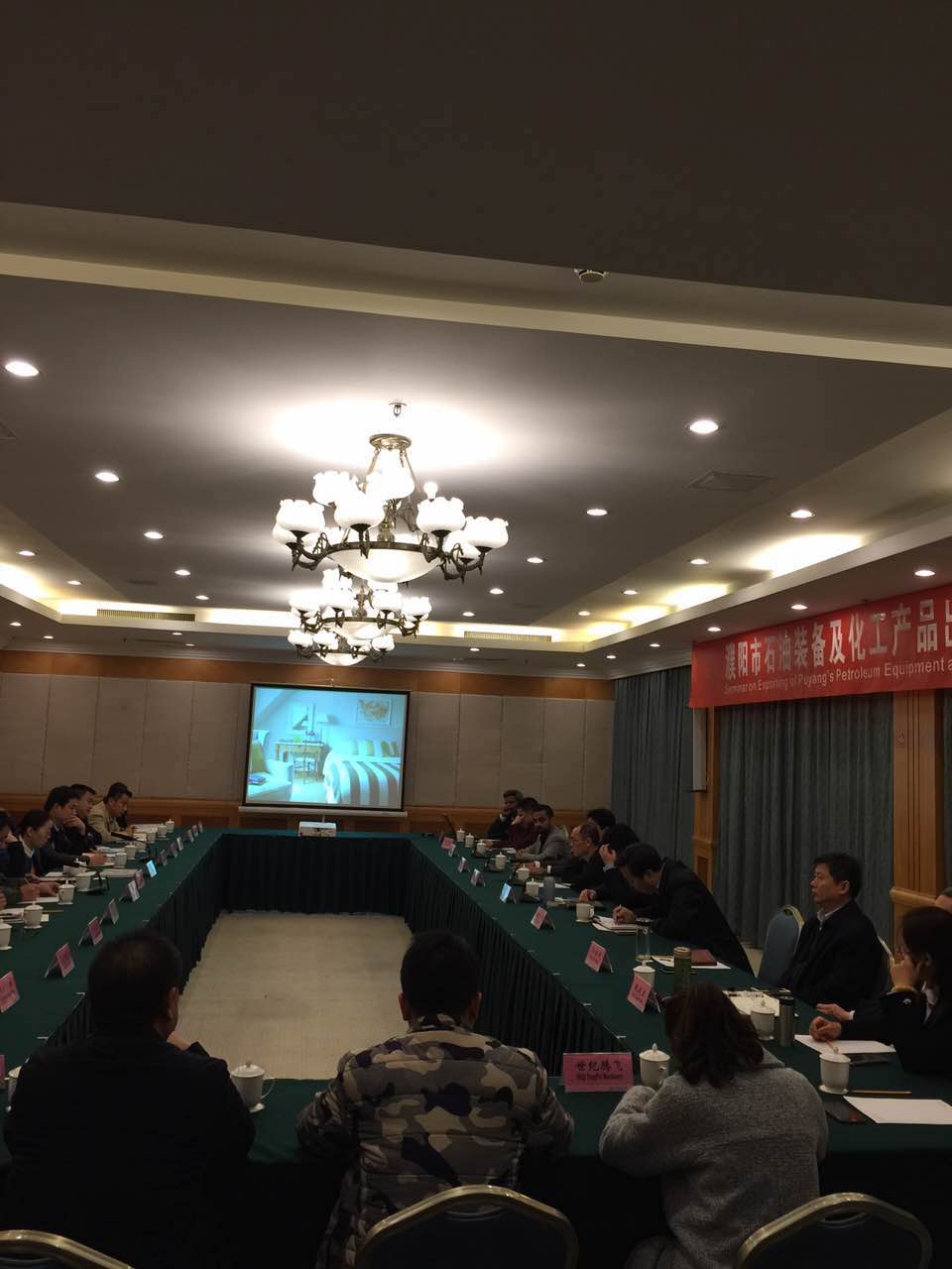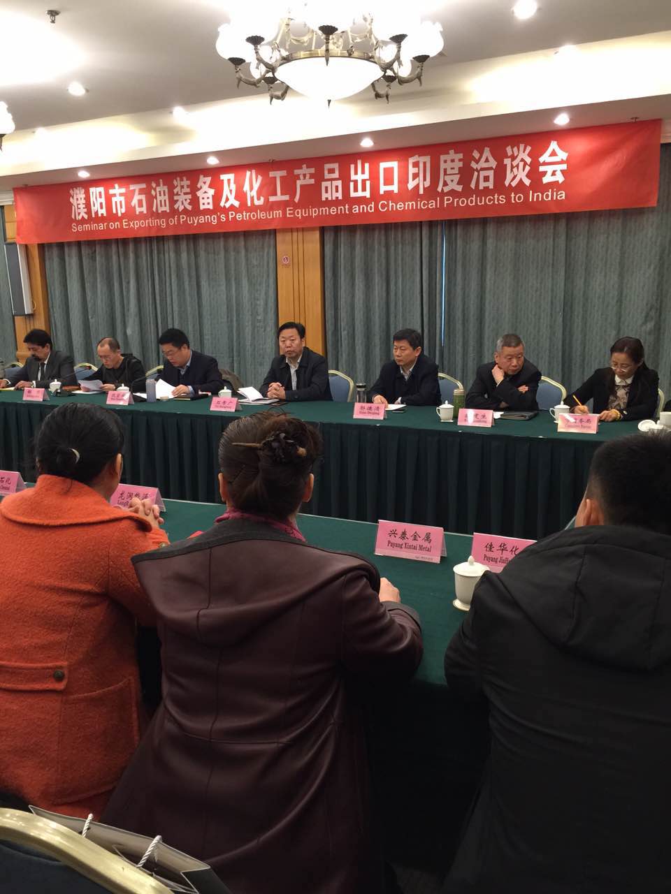 2017年3月13日上午,市工信委副主任郭德清带领装备科有关人员,召集中原总机、信宇石油、中石集团、佳华化工等30余家企业在市迎宾馆参加石油装备及化工产品出口印度对接洽谈会。与印度日升国际贸易公司、阿联酋DHRUV贸易公司、印度石油公司有关负责人进行了深入洽谈。会议就加大力度发展石油装备和石化产品贸易,石油装备和石化产业合作达成了共识,提速我市石油装备和石油化工企业拓展海外市场步伐。
