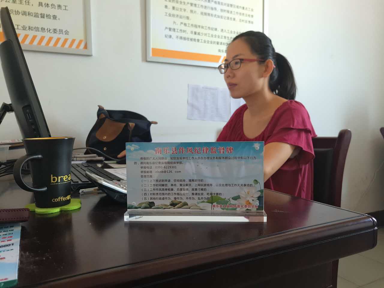 根据南乐县纪委《关于设立作风纪律监督桌牌的通知》要求,为进一步优化干部作风,强化自觉接受社会各界监督的意识,县工信委高度重视,认真学习传达文件精神,立即开展设立纪律桌牌行动。本次行动分别在产业管理股、工业经济运行股、县信息化工作办公室、企业信息服务中心,制作了作风纪律监督桌牌,并在显著位置进行了摆放,自觉接受社会的监督。