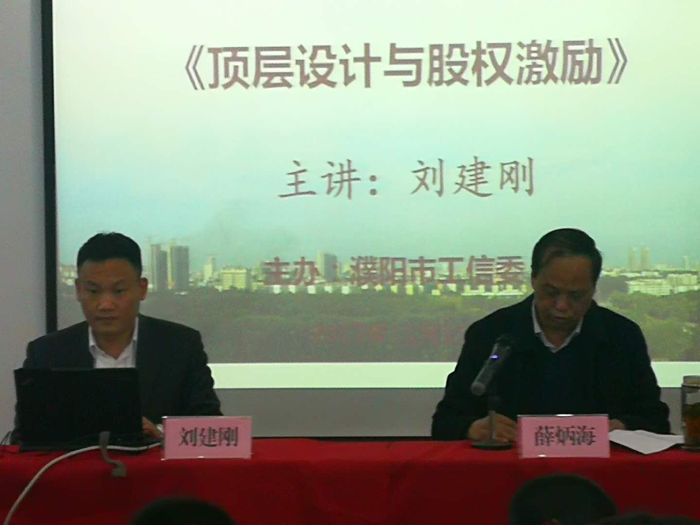 为深入贯彻落实十九大精神,深化"惠企政策进千企"服务企业系列活动,加快推动我市中小企业对接资本市场,全面把握当前多层次资本市场特点和国家政策方向,11月13日,市工信委组织企业上市培训会。我市60余名优质中小企业董事长(总经理)参加。培训会邀请深圳前海中力企业管理顾问有限公司董事长、前海股权事务所创始合伙人、全国中小企业商业与股权研究中心执行主任刘建刚老师授课。刘老师以《顶层设计与股权激励》为题,系统解决了企业商业模式、战略规划、公司治理、组织运营、上市规划、资本运作等知识。该培训会将指导与会企业树立先进的经营管理理念,加快推动企业转型升级,做大做强。