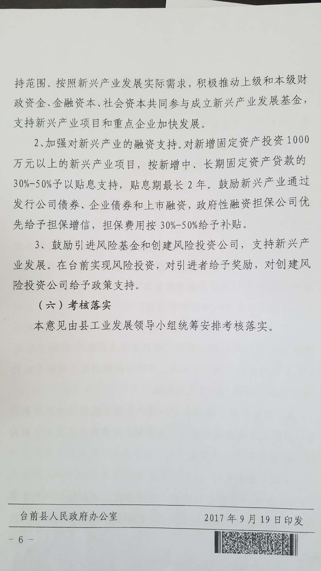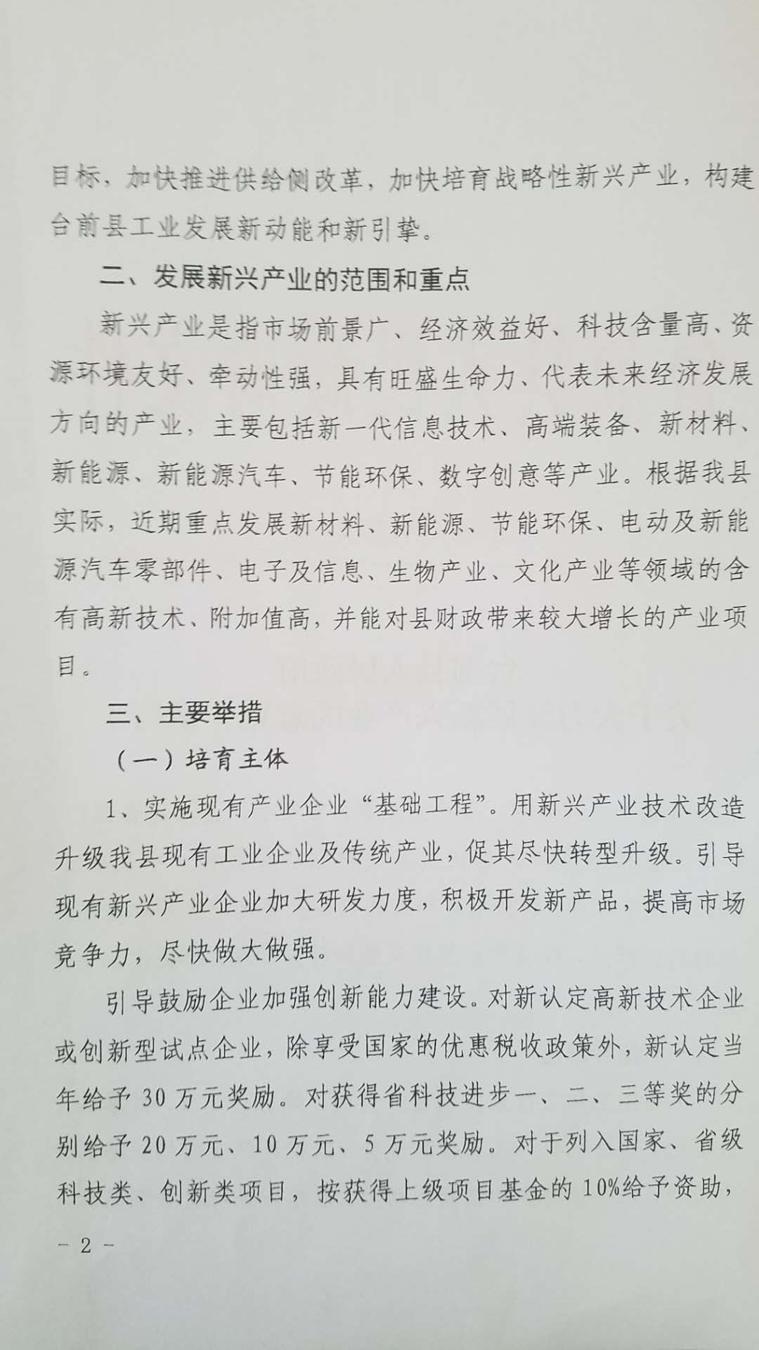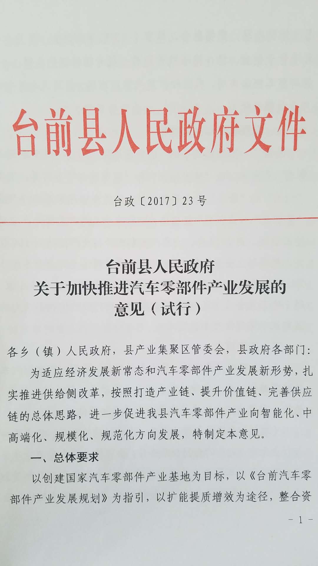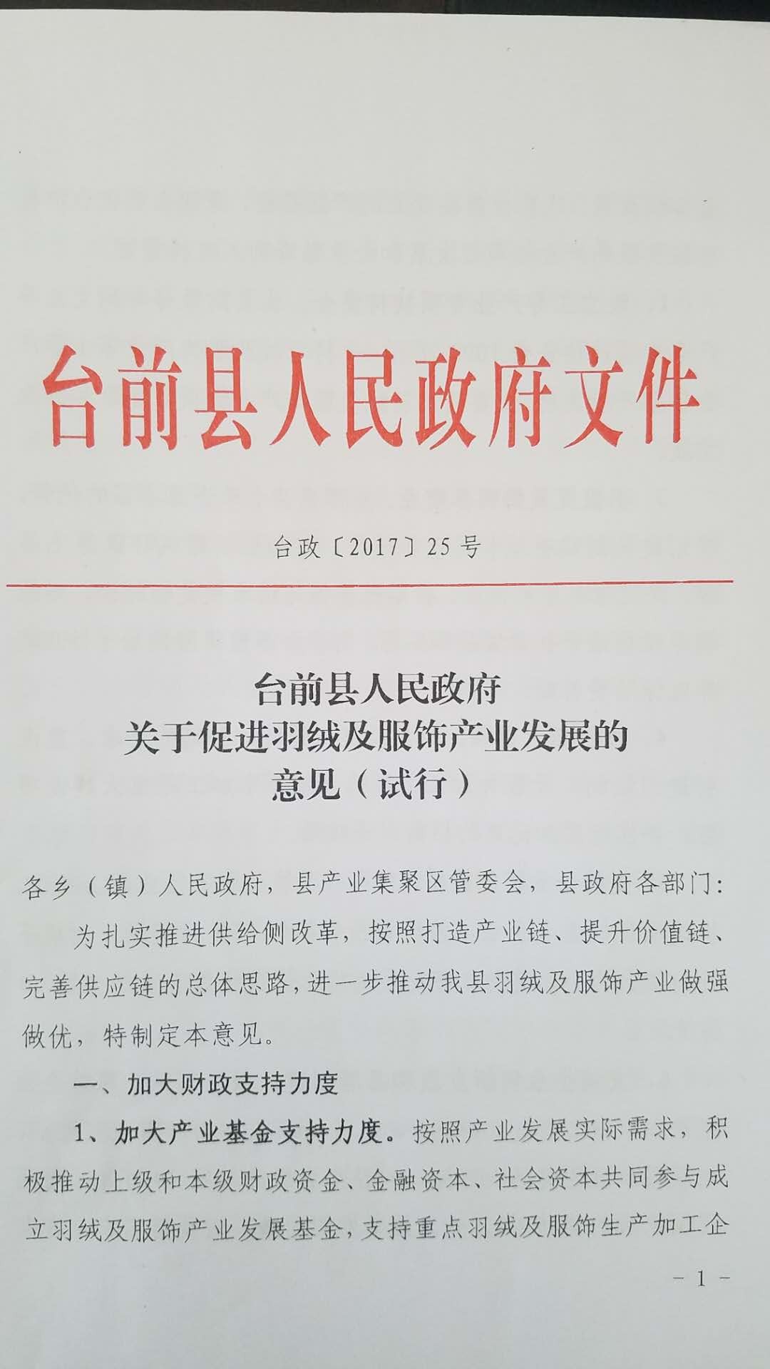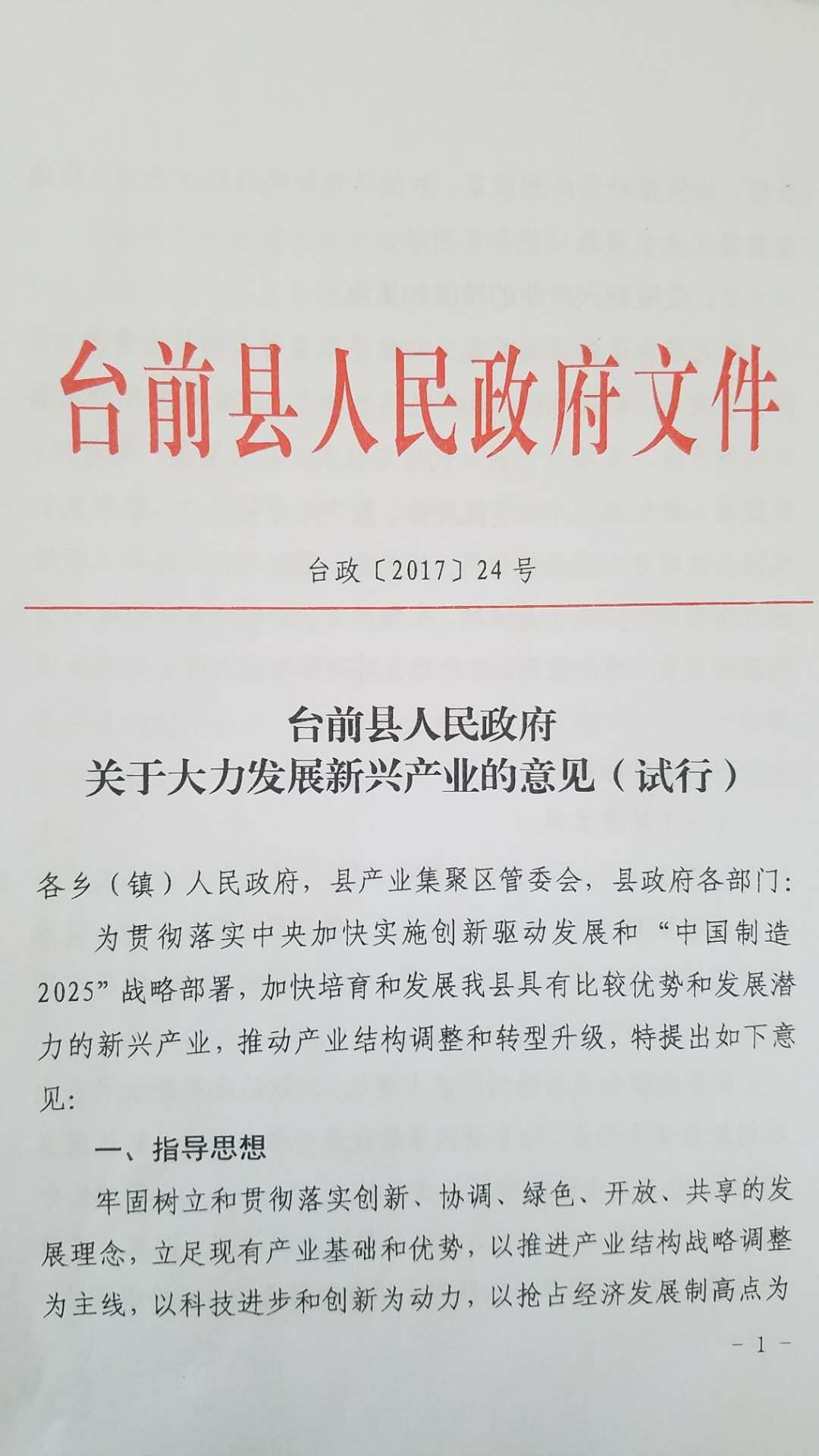 近期,台前县委、县政府为推动工业发展和产业转型升级,先后出台了《台前县人民政府关于加快推进汽车零部件产业发展的意见(试行)》(台政[2017]23号)、《台前县人民政府关于大力发展新兴产业的意见(试行)》(台政[2017]24号)和《台前县人民政府关于促进羽绒及服饰产业发展的意见(试行)》(台政[2017]25号)等文件,为台前主导产业发展创造良好的环境。