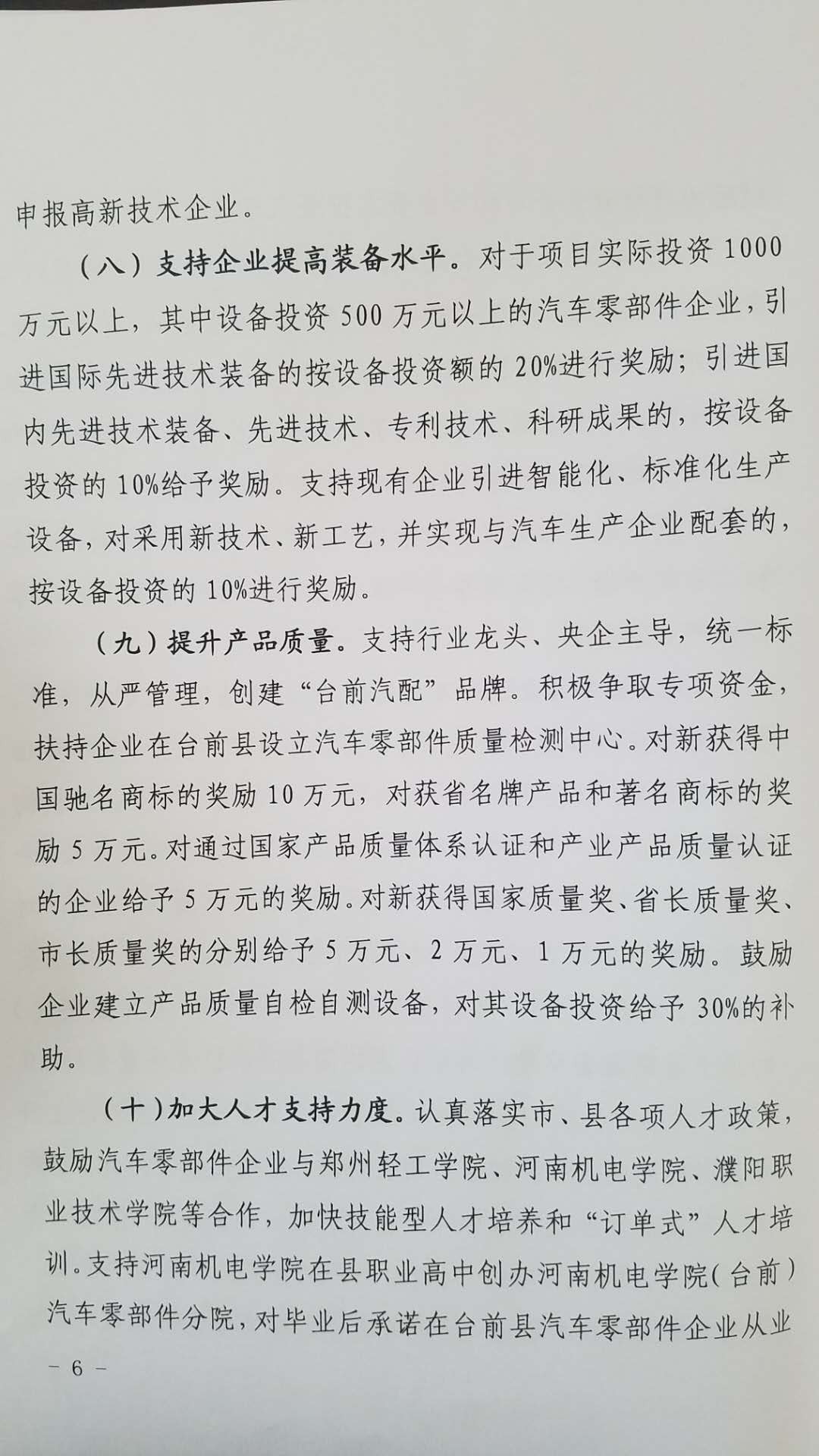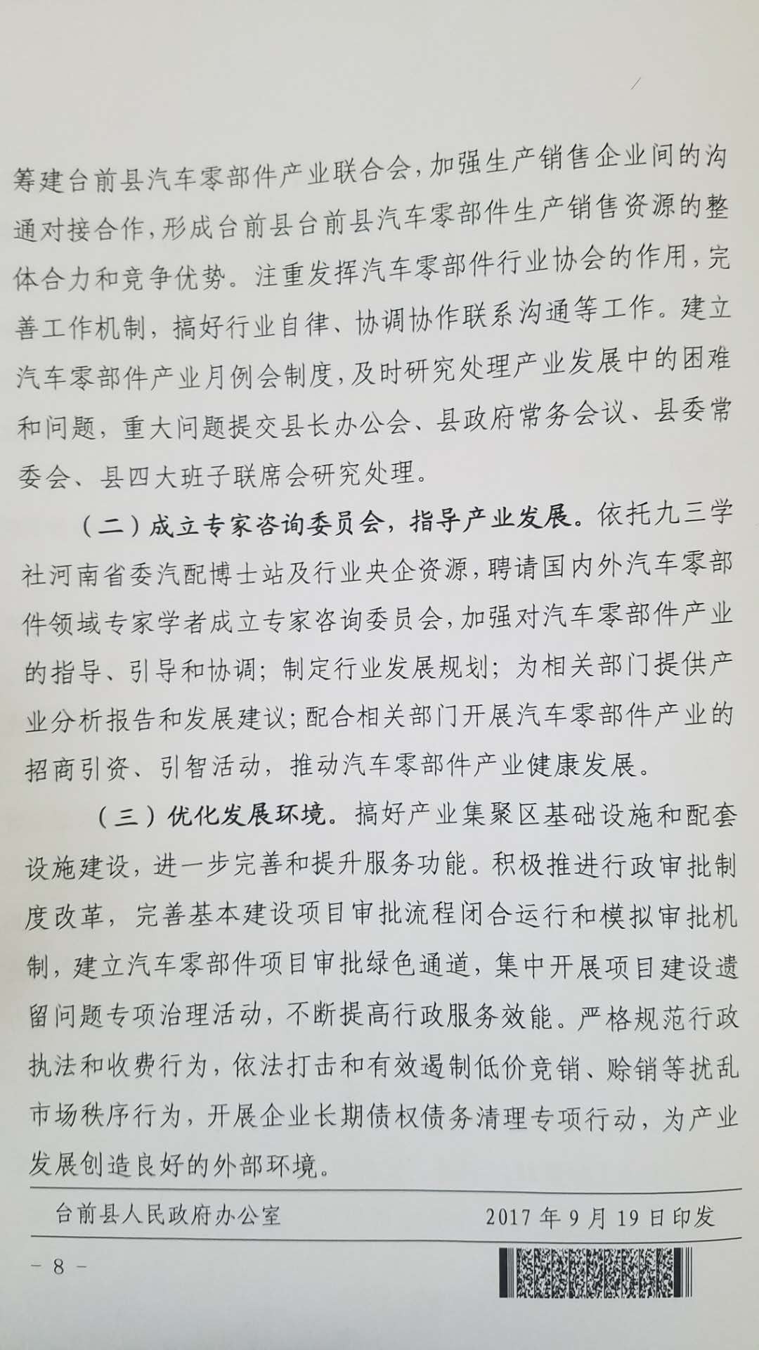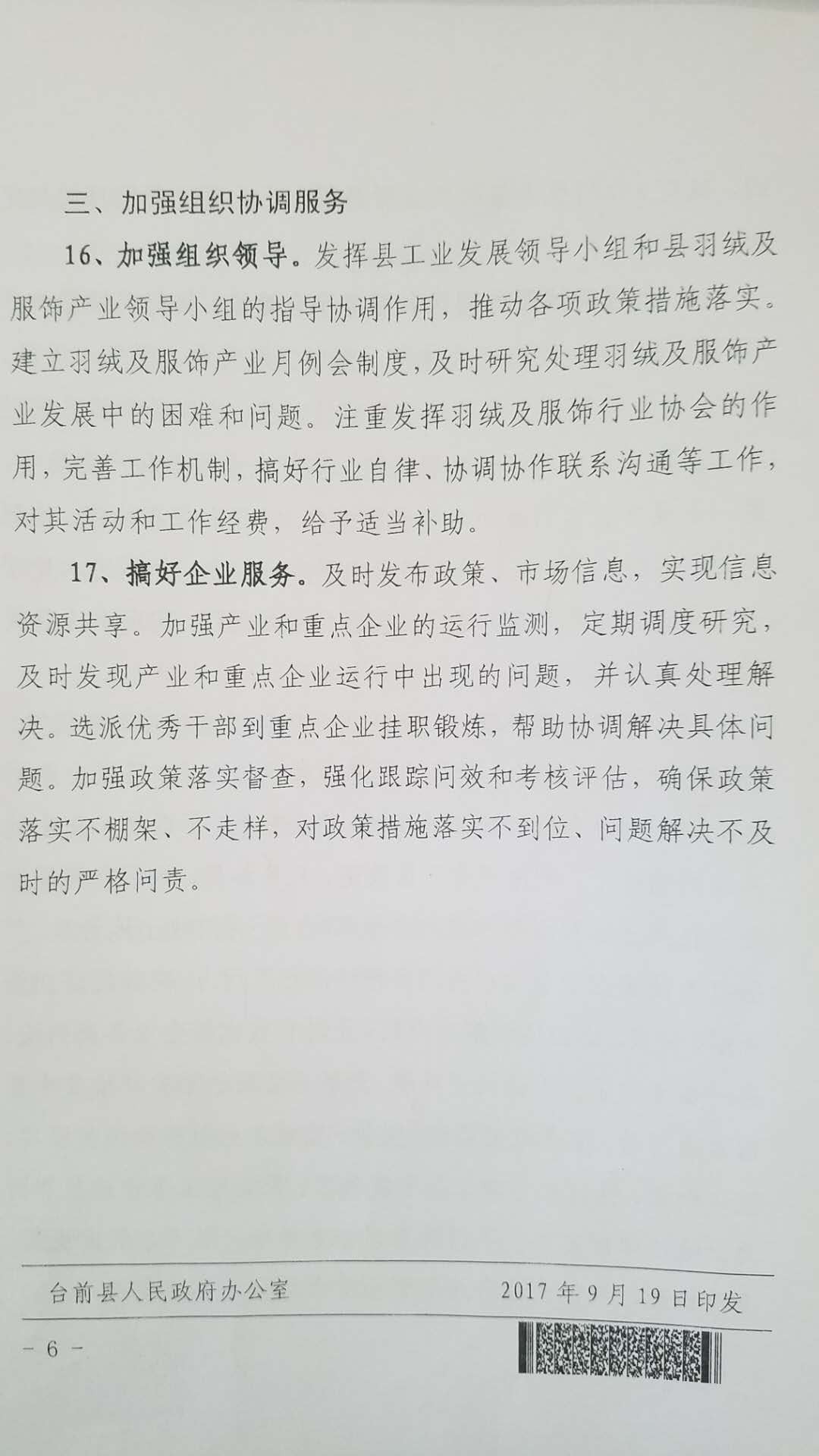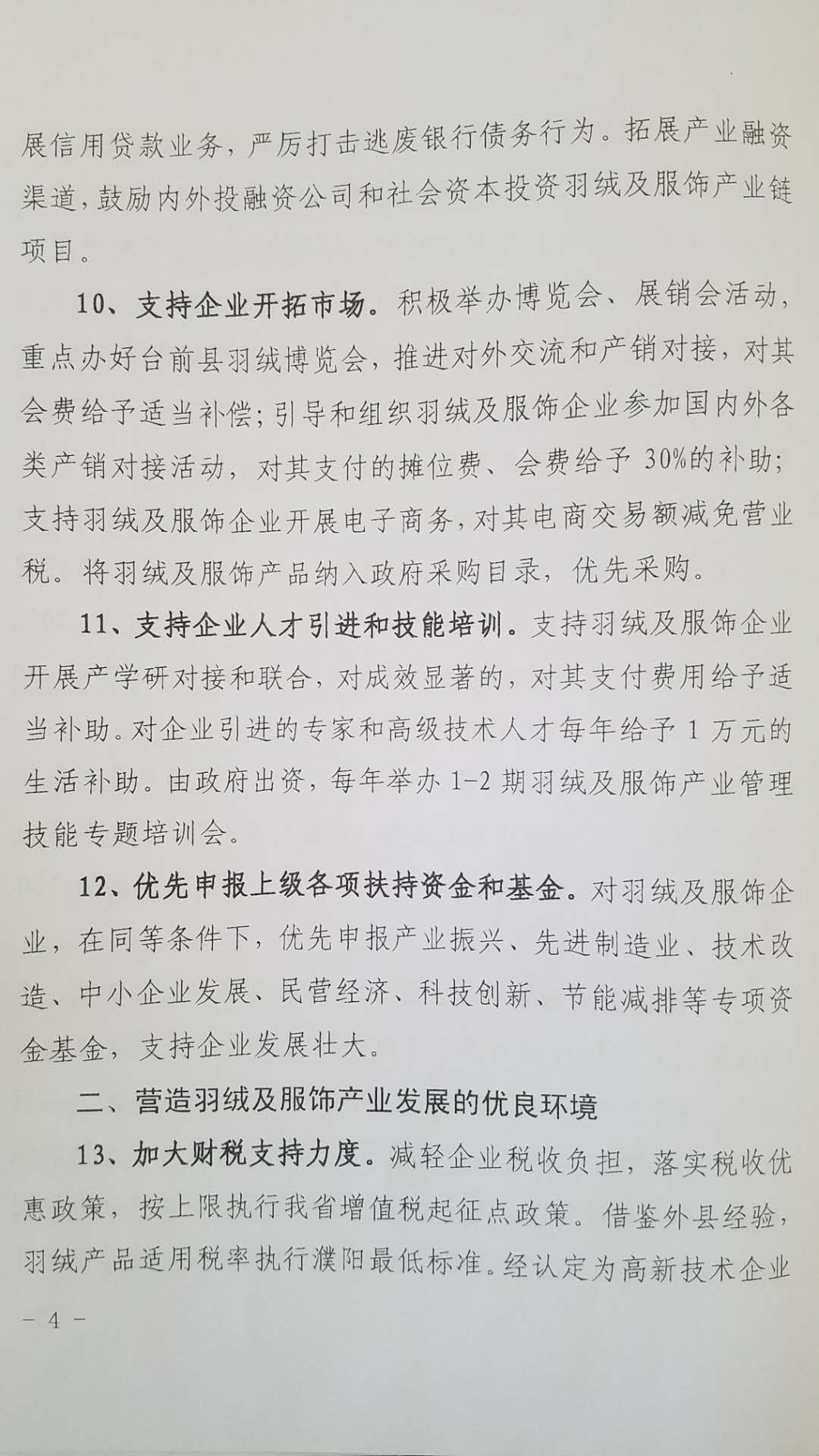 近期,台前县委、县政府为推动工业发展和产业转型升级,先后出台了《台前县人民政府关于加快推进汽车零部件产业发展的意见(试行)》(台政[2017]23号)、《台前县人民政府关于大力发展新兴产业的意见(试行)》(台政[2017]24号)和《台前县人民政府关于促进羽绒及服饰产业发展的意见(试行)》(台政[2017]25号)等文件,为台前主导产业发展创造良好的环境。