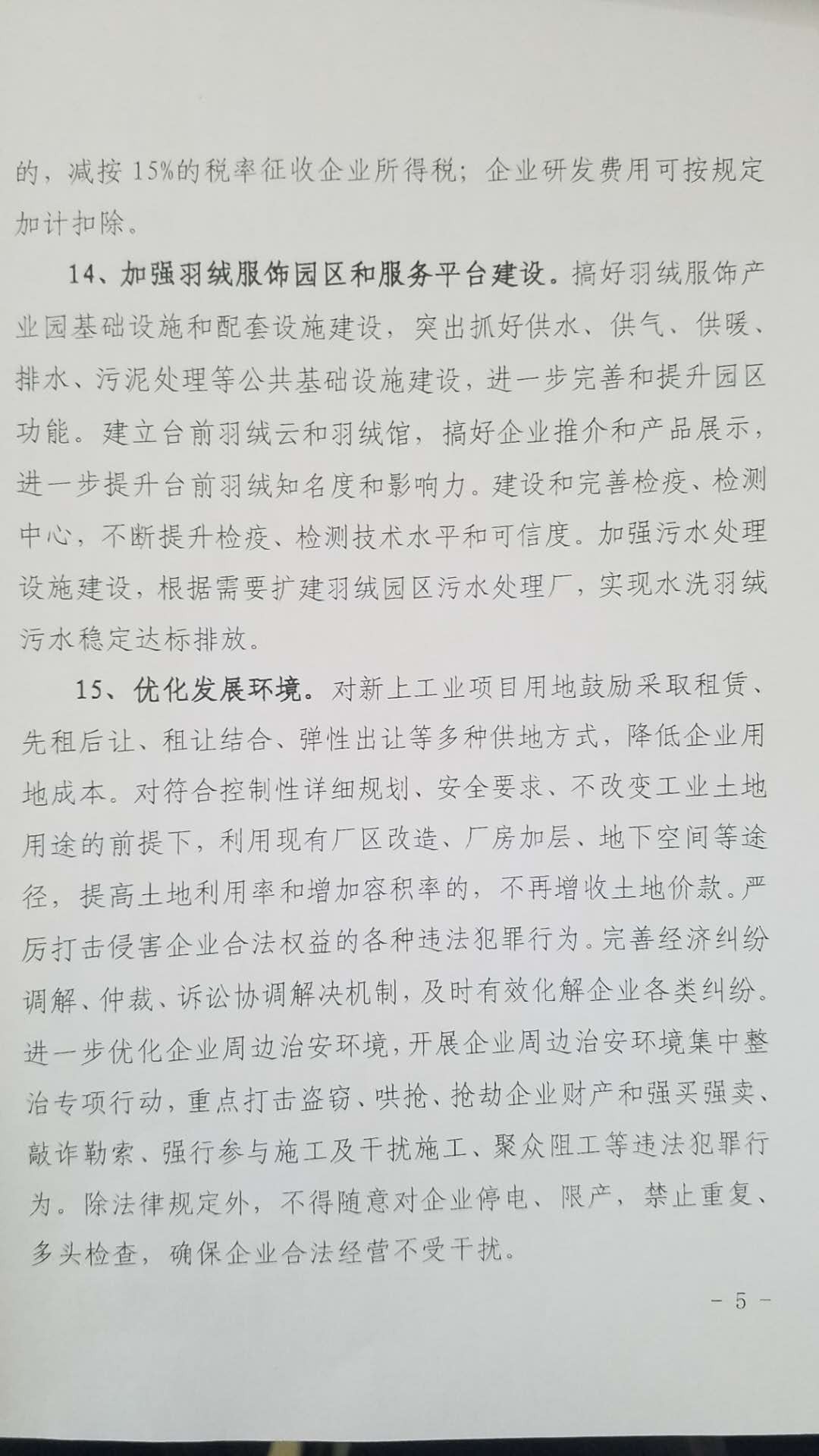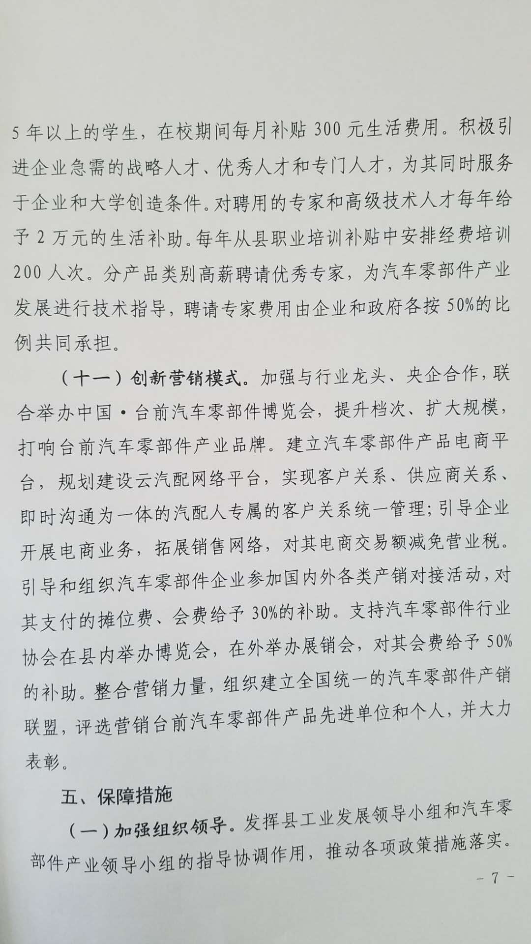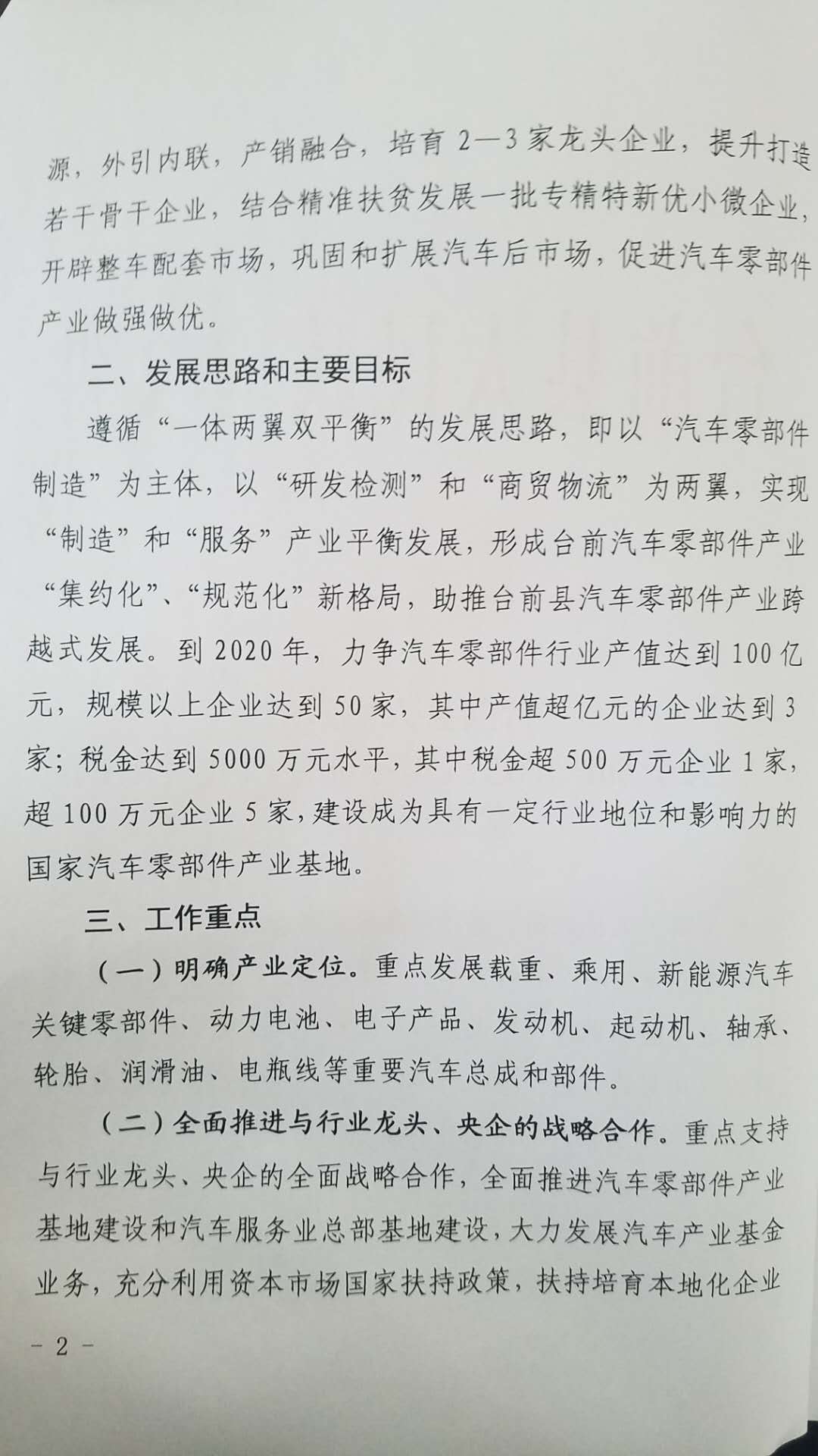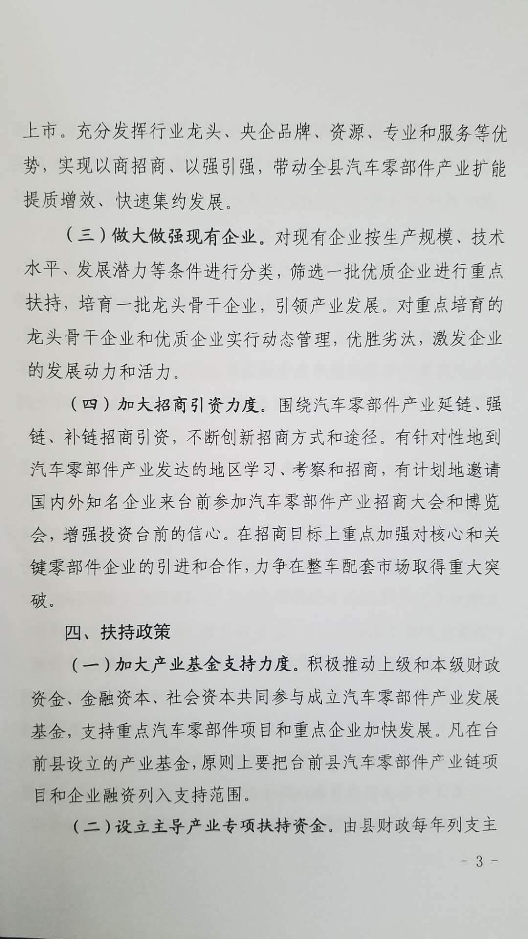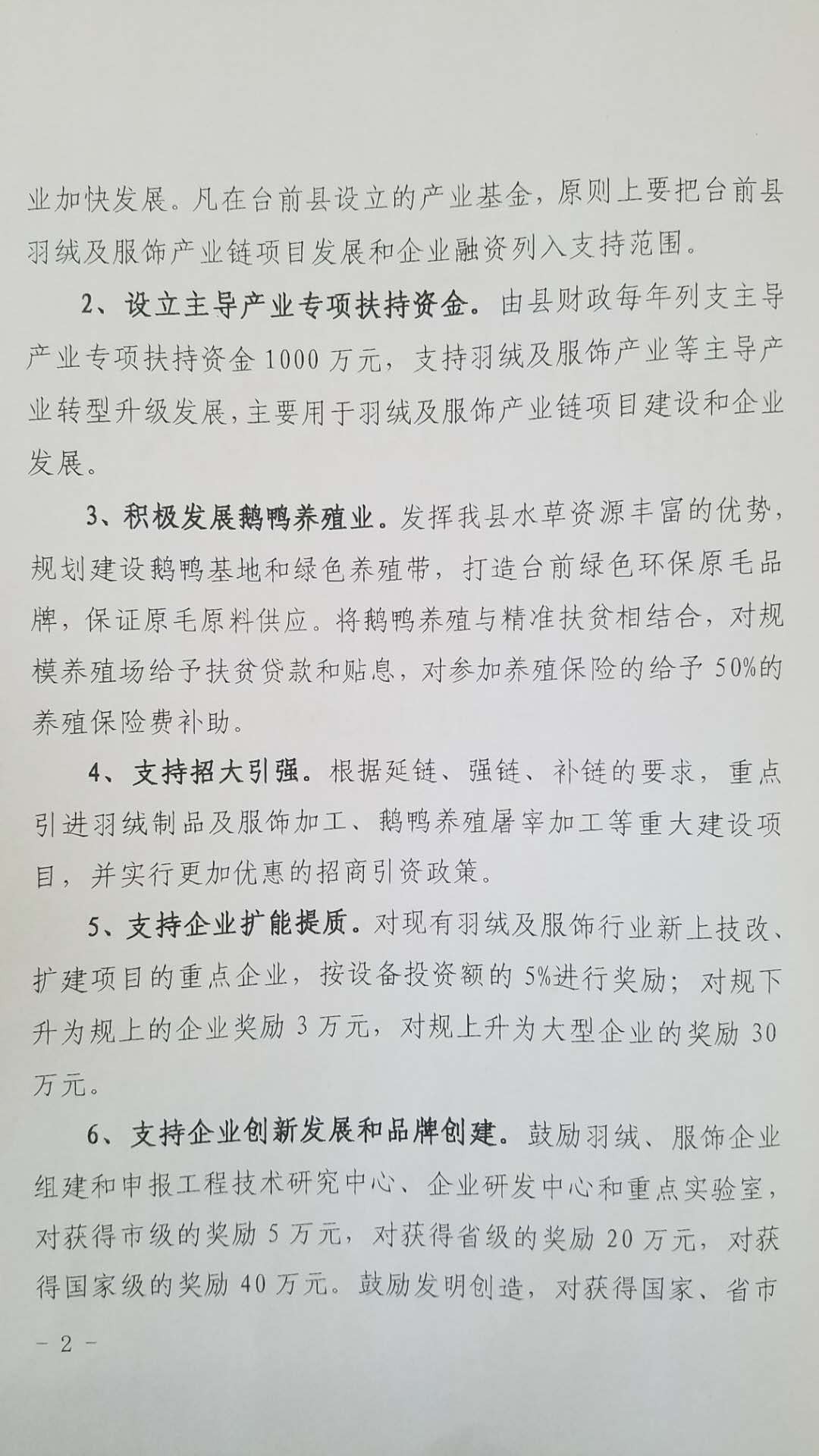 近期,台前县委、县政府为推动工业发展和产业转型升级,先后出台了《台前县人民政府关于加快推进汽车零部件产业发展的意见(试行)》(台政[2017]23号)、《台前县人民政府关于大力发展新兴产业的意见(试行)》(台政[2017]24号)和《台前县人民政府关于促进羽绒及服饰产业发展的意见(试行)》(台政[2017]25号)等文件,为台前主导产业发展创造良好的环境。