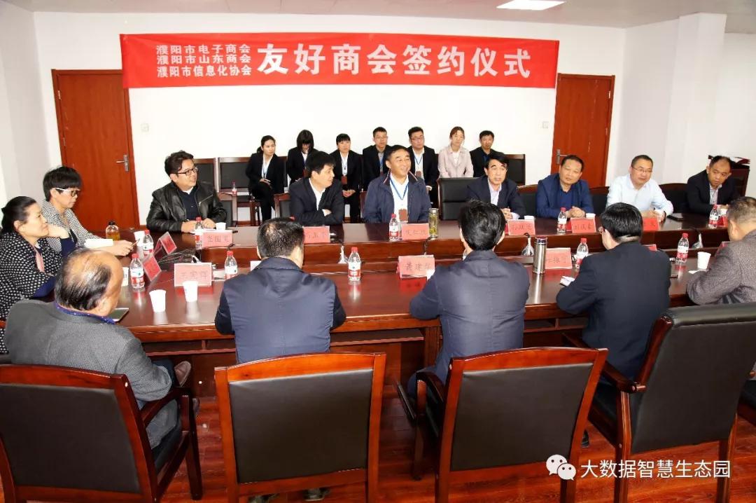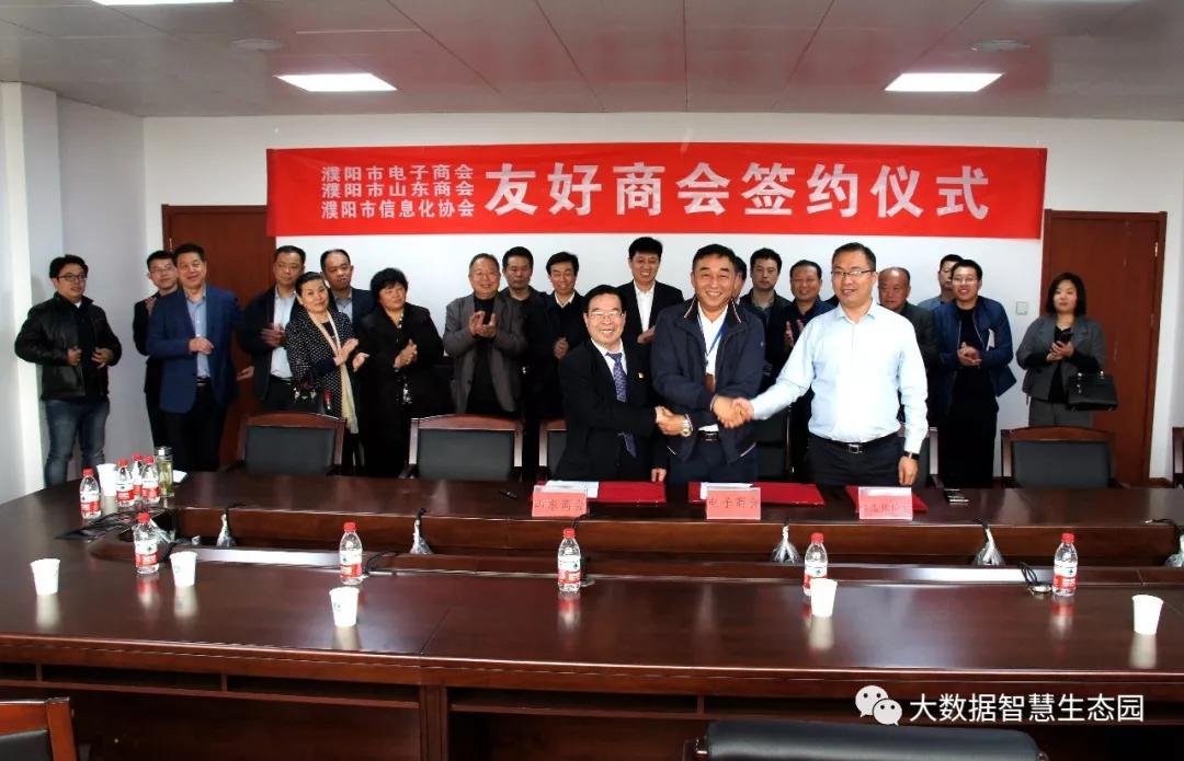 4月10日,在大数据智慧生态园临时机房会议室,举办濮阳市电子商会(简称电子商会)、濮阳市山东商会(简称山东商会)、濮阳市信息化协会(简称信息化协会)三方友好商会合作签约仪式。濮阳市工信委副主任孙跃进、濮阳市信息化工作办公室主任刘庆豪作为特邀见签人出席仪式。电子商会会长、河南智慧大数据生态园发展有限公司总经理庆红胜,副会长、河南智慧大数据生态园发展有限公司副总经理高玉华等;山东商会会长、河南信宇股份有限公司董事长杜振宇,副会长、濮阳市汇丰置业有限公司书记张献斌等;信息化协会会长、濮阳绿探集团董事长高海华,秘书长杜戈等作为商会代表参加仪式。