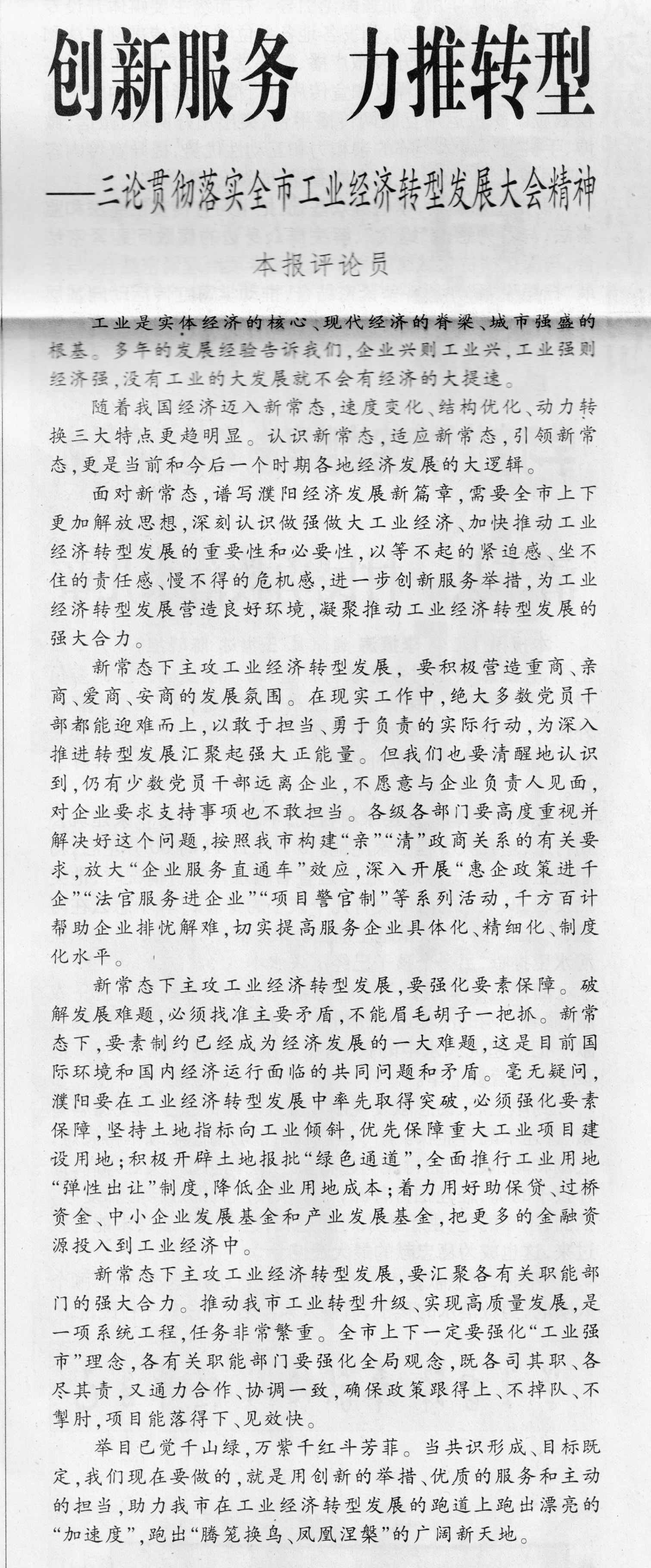 面对新常态,谱写濮阳经济发展新篇章,需要全市上下更加解放思想,深刻认识做强做大工业经济、加快推动工业经济转型发展的重要性和必要性,以等不起的紧迫感、坐不住的责任感、慢不得的危机感,进一步创新服务举措,为工业经济转型发展营造良好环境,凝聚推动工业经济转型发展的强大合力。