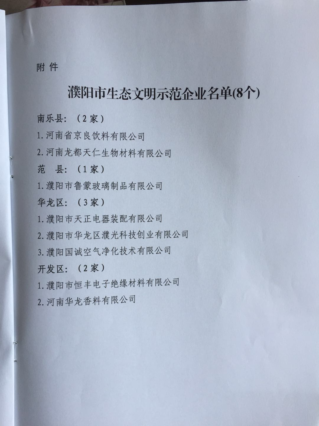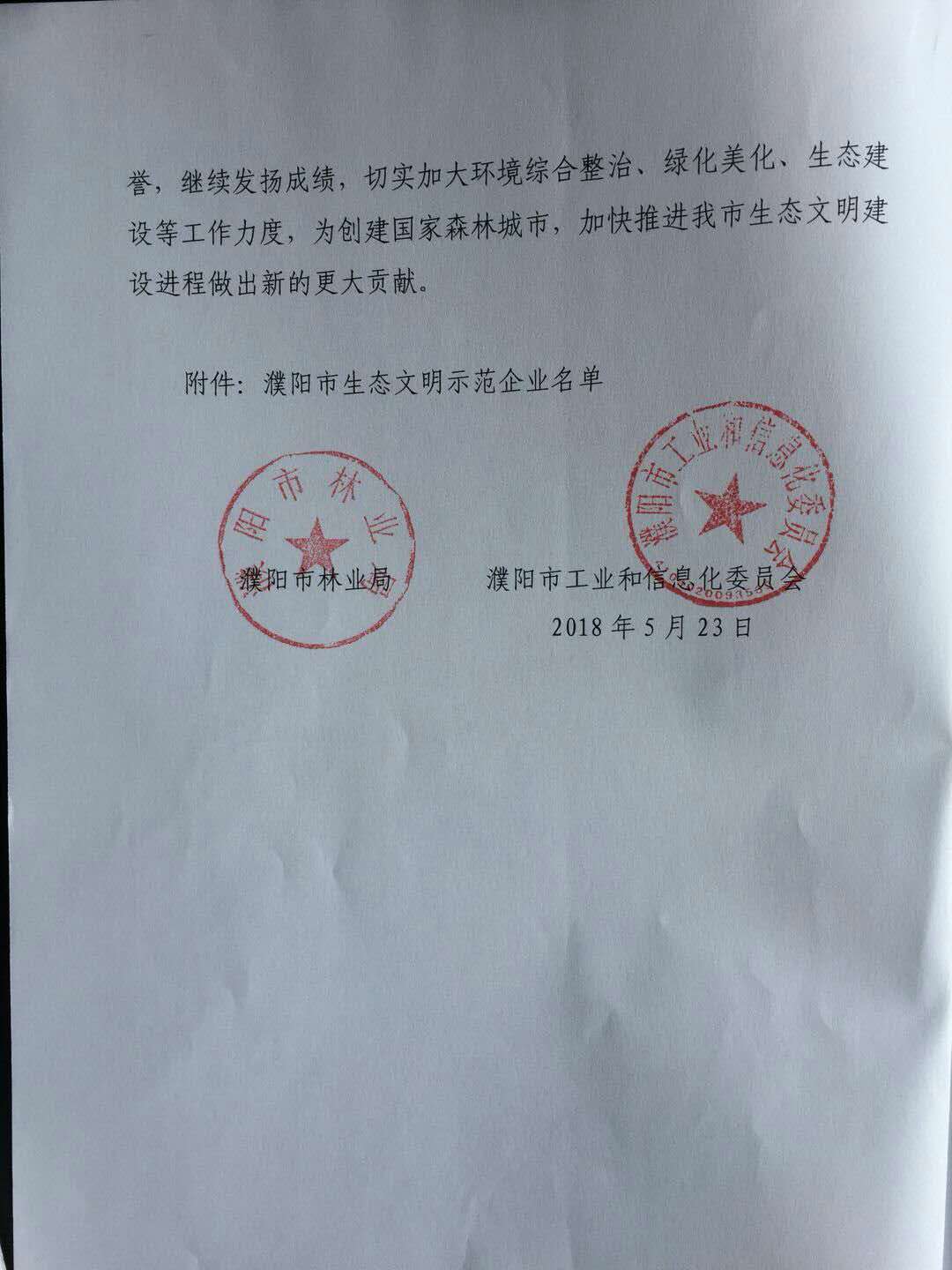 华龙区3家企业荣获濮阳市生态文明示范企业称号