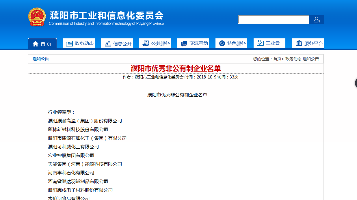 10月9日,濮阳市优秀非公有制企业名单发布,我县4家优秀非公有制企业入选。其中,河南丰利石化有限公司、濮阳盛源石油化工(集团)有限公司、濮阳可利威化工有限公司3家企业入选行业领军型优秀非公有制企业,濮阳盛华德化工有限公司入选成长创新型优秀非公有制企业。