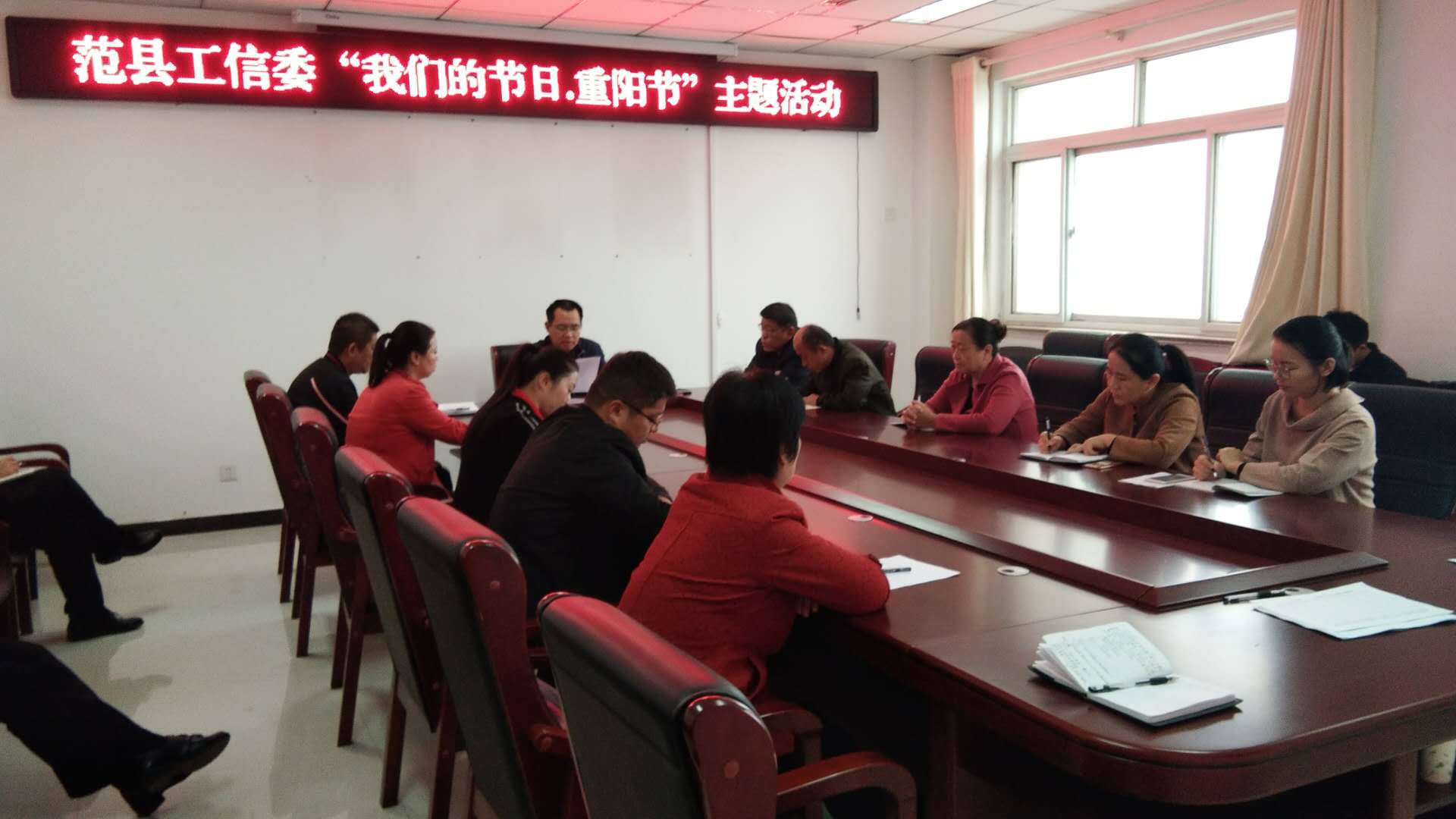 10月17日上午,范县工信委组织全体干部职工开展“我们的节日.重阳节”主题活动。会上,史燕军主任强调:我们要坚持以党的十九大精神为指引,以“老有所养、老有所医、老有所学、老有所教、老有所乐”为目标,做到常怀爱老之情,常扬敬老之德,常兴助老之风,常办利老之事,不断提高敬老、爱老工作水平,为推进我县老年事业蓬勃发展增光添彩。首先在工作中我们要主动向老同志学习他们丰富的工作经验和高尚的思想素养,时刻尊重和保护老同志;其次在生活中我们要孝敬老人,替老人们考虑周全,细致体贴,营造孝老爱亲的社会氛围。