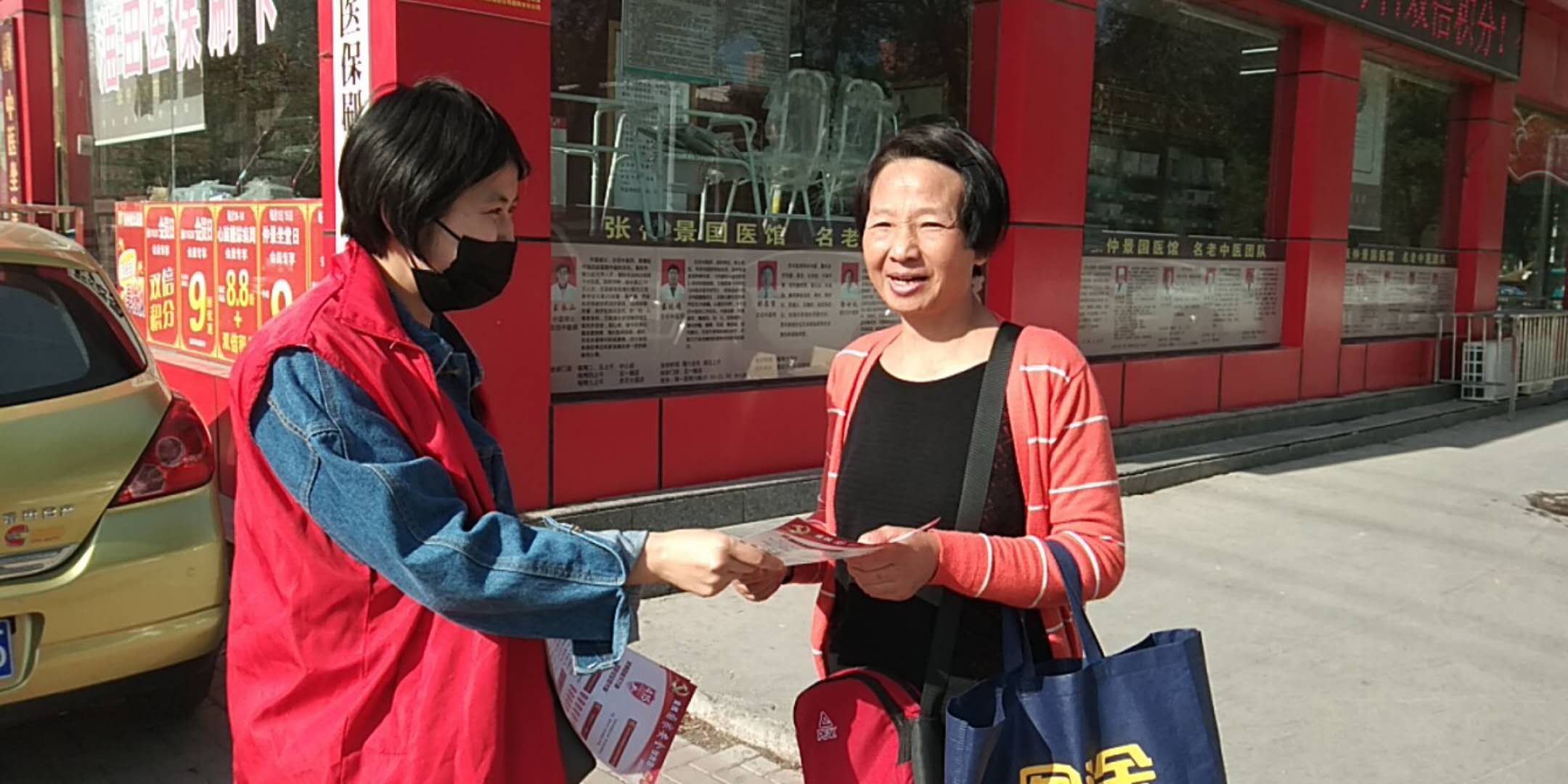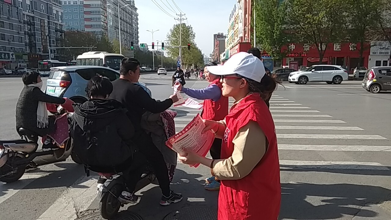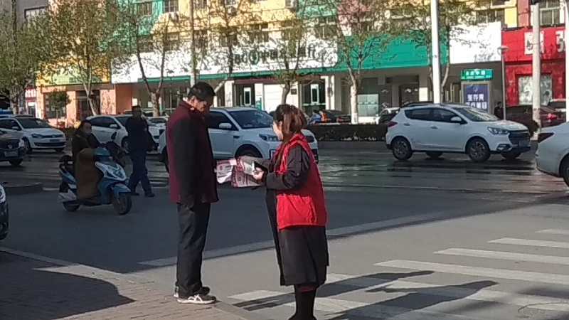 志愿者在主次干道向行人发放宣传材料