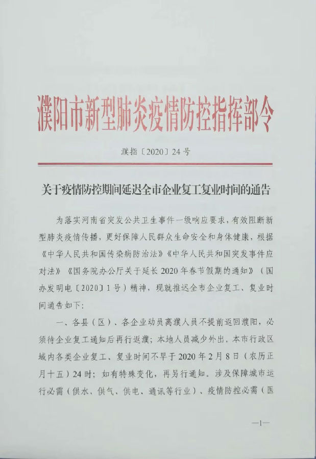 关于疫情防控期间延迟全市企业复工复业时间的通告