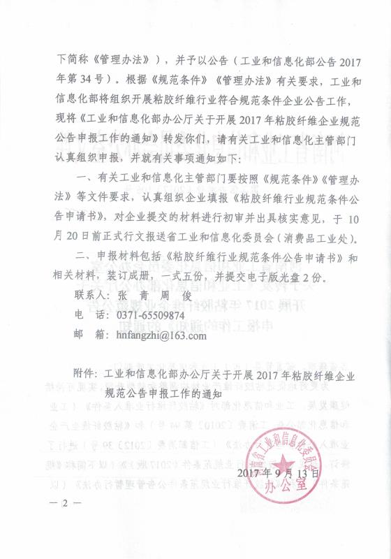 附件2:工信部办公厅关于开展2017年粘胶纤维企业规范公告申报工作的通知