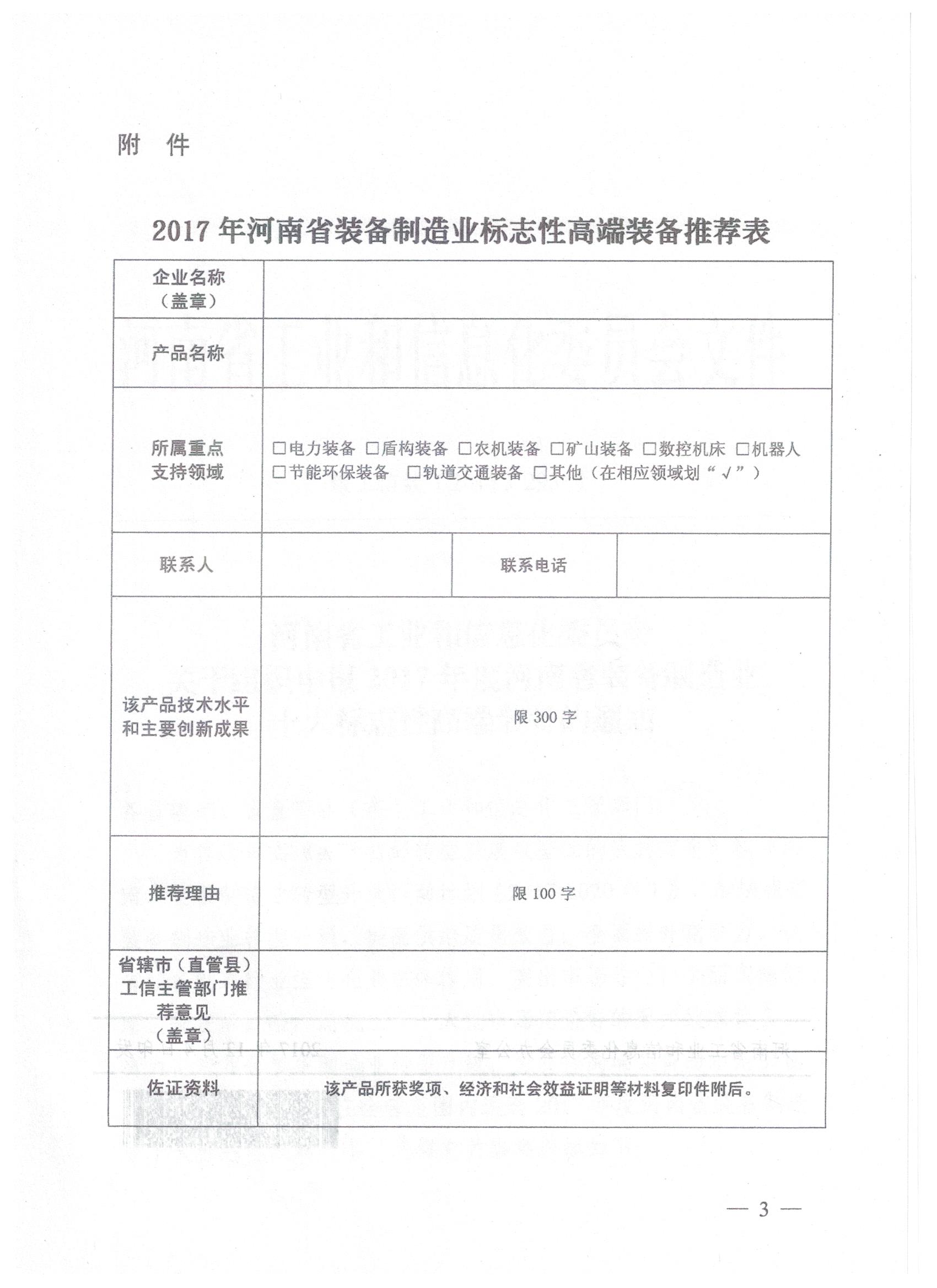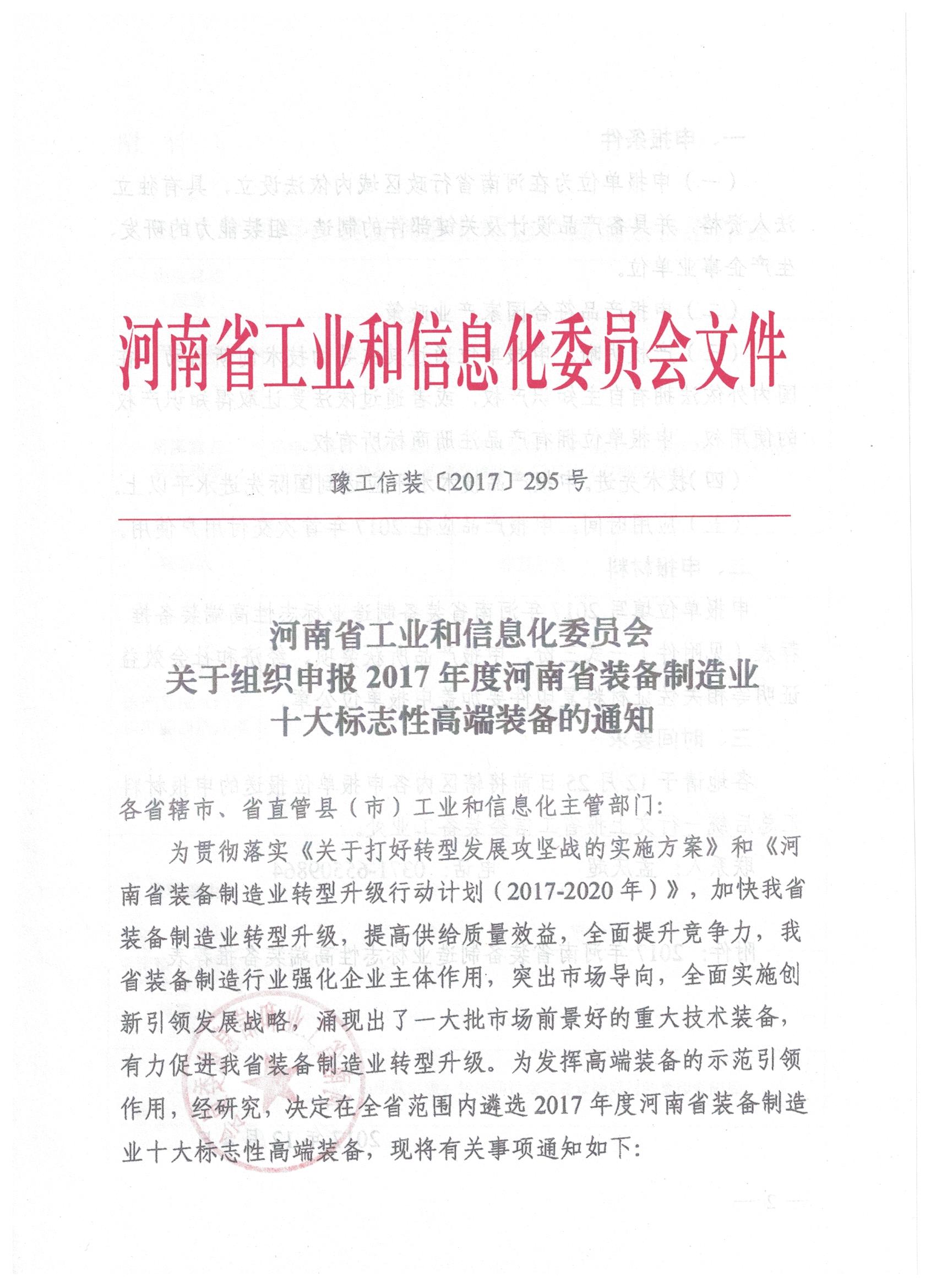 河南省工业和信息化委员会关于组织申报2017年度河南省装备制造业十大标志性高端装备的通知