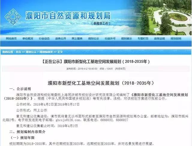 4月2日,濮阳市新型化工基地空间发展规划(2018-2035年)在濮阳市自然资源和规划局网站进行公示。